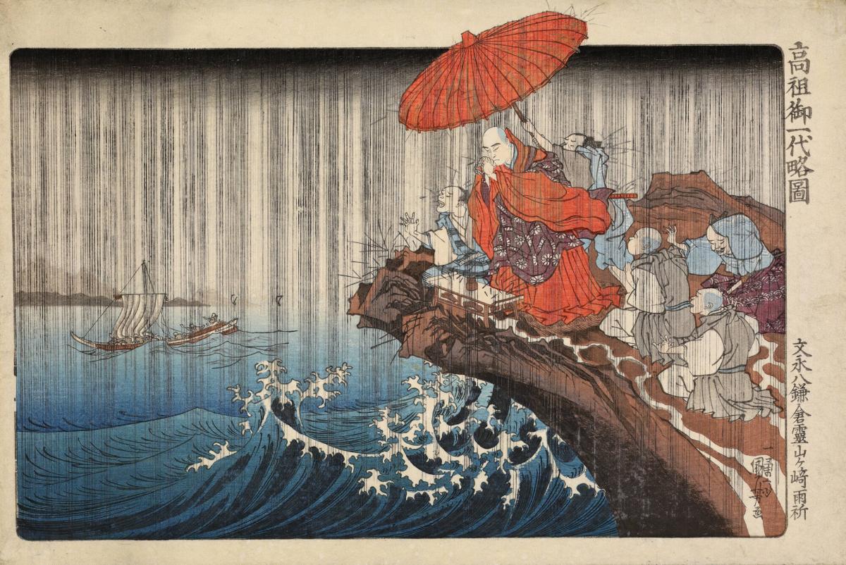 Nichiren Prays for Rain at the Promontory of Ryozangasaki in Kamakura in 1271, from the series A Short Pictorial Biography of the Founder of the Nichiren Sect