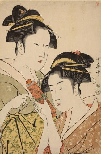 Not on viewKasamori Osen 笠森お仙 was considered one of the “Three Beauties” of the Meiwa 明和 era (1764–72), inspiring plays, poems, dolls, and even commemorative towels. She was perhaps most celebrated as a subject of prints, particularly by Harunobu. In this print she symbolically passes on her secrets to a beauty of the current era, Ohisa, who was like Osen a server at a famous teahouse.