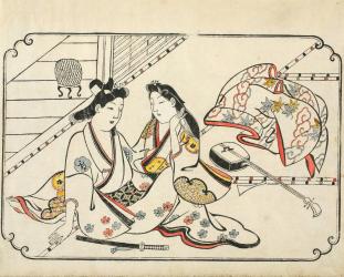 Not on viewA courtesan and young man, or wakashū, are depicted leaning toward each other in a relaxed, intimate fashion, the young man’s robe tossed casually on the floor behind them. He has removed his sword, and it lies near him. Similarly, she has finished playing her shamisen, and it lies with the robe. This is one of the first in a series of approximately fourteen prints that portray a sequential narrative. The imagery becomes more and more erotic as the series progresses. This type of subject was known at the time as “pillow pictures” (makura-e), “dangerous pictures” (abuna-e), and even “giggling pictures” (warai-e).