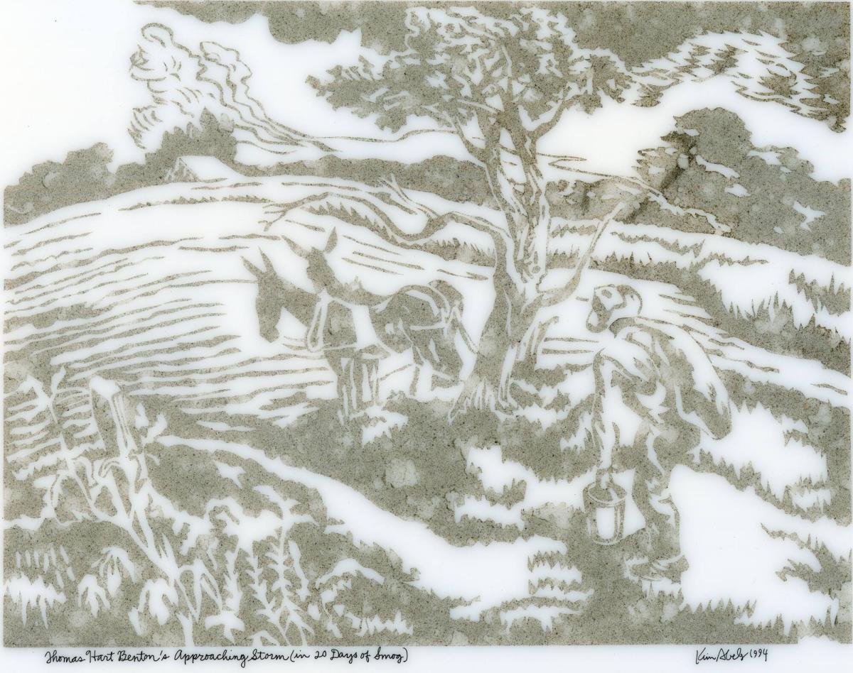 Not on viewAbeles’s ongoing Smog series uses atmospheric pollution as a medium to recreate scenes of American art and life. After leaving carefully covered plexiglas plates on the roof of her Los Angeles studio for 20 days, Abeles peels back her stencil to reveal an image captured in the smog that accumulated on its surface. This rendition of Thomas Hart Benton’s Approaching Storm gives a new dimension of threat to the looming clouds by rendering them in car exhaust and industrial emissions.