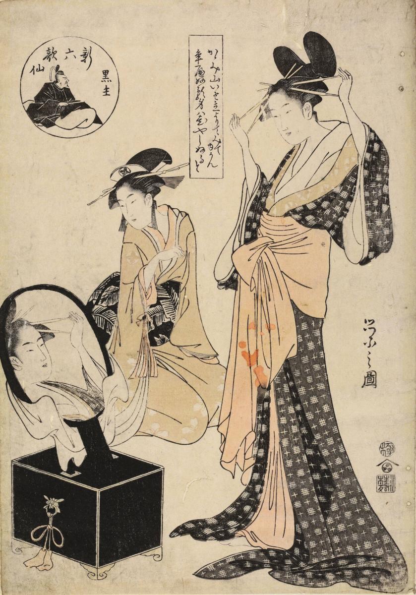 Courtesan Standing Before a Mirror; Illustrating a Poem by Otomo Kuronushi, from the series A New Version of the Six Immortal Poets