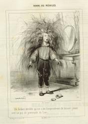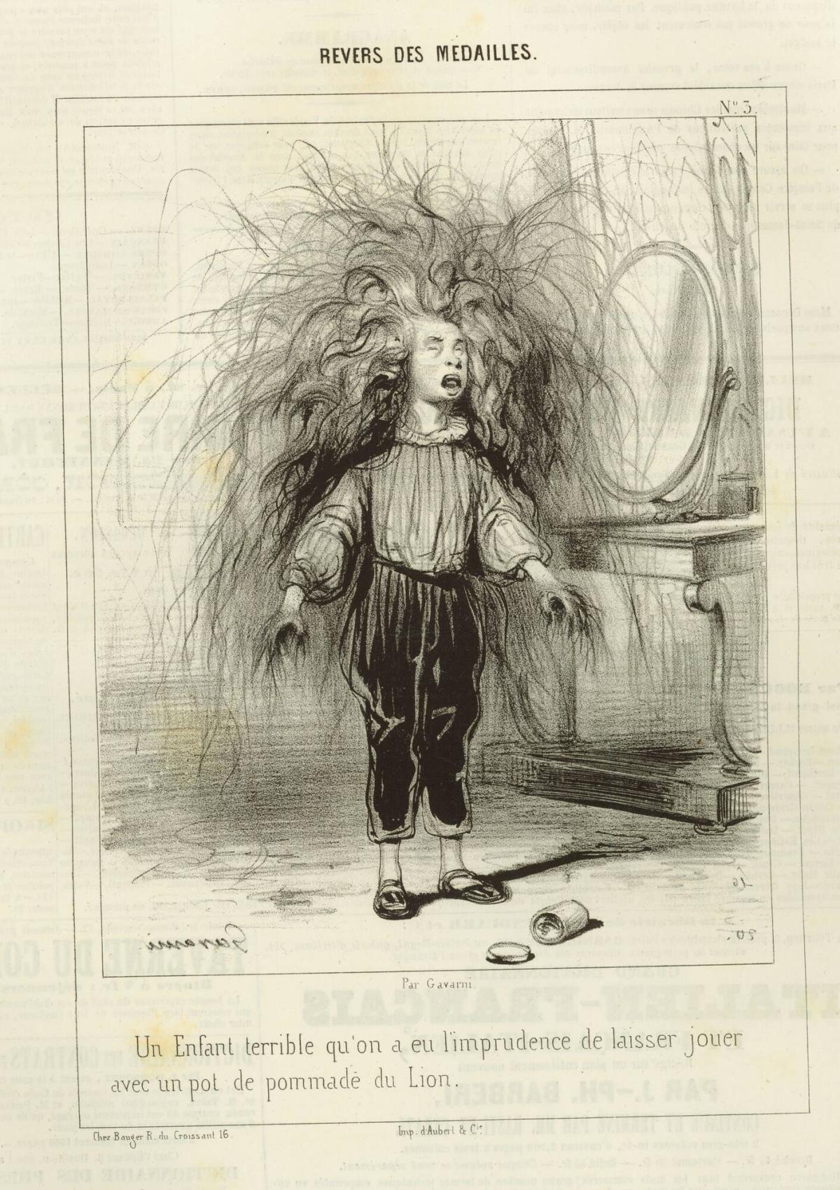 Not on viewAn illustrator of children’s books, Gavarni was the father of two children of his own, to whom he was very attached. Gavarni loved the spontaneous poses and gestures of children and admired them for their disarming honesty. In this print, a boy has gotten into his father’s hair pomade, creating an enormous mess and embodying the cultural stereotype that boys are naughty and can be expected to get into trouble. The caption below the image reads: “An unruly child that someone was foolish enough to let play with a jar of hair cream for dandies.”