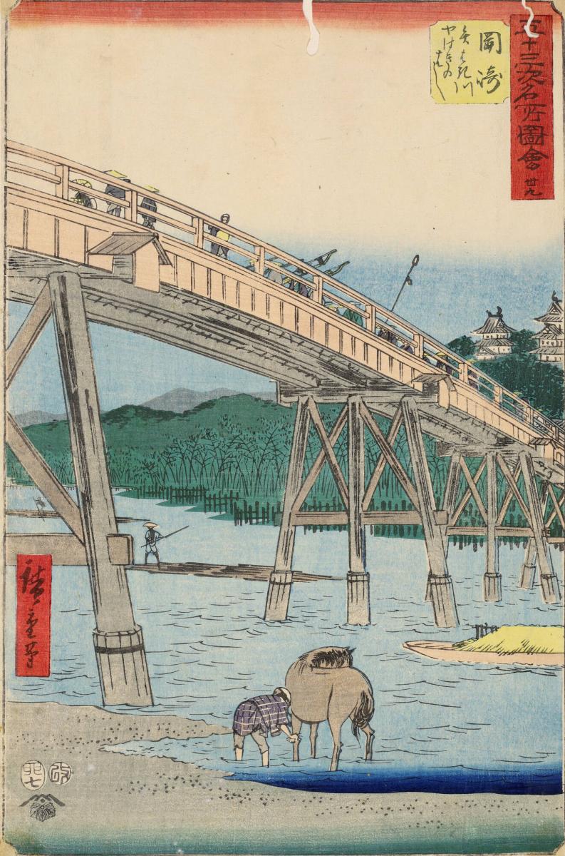 Yahagi Bridge on the Yahagi River at Okazaki, no. 39 from the series Pictures of Famous Places of the Fifty-three Stations, the Vertical Tōkaidō