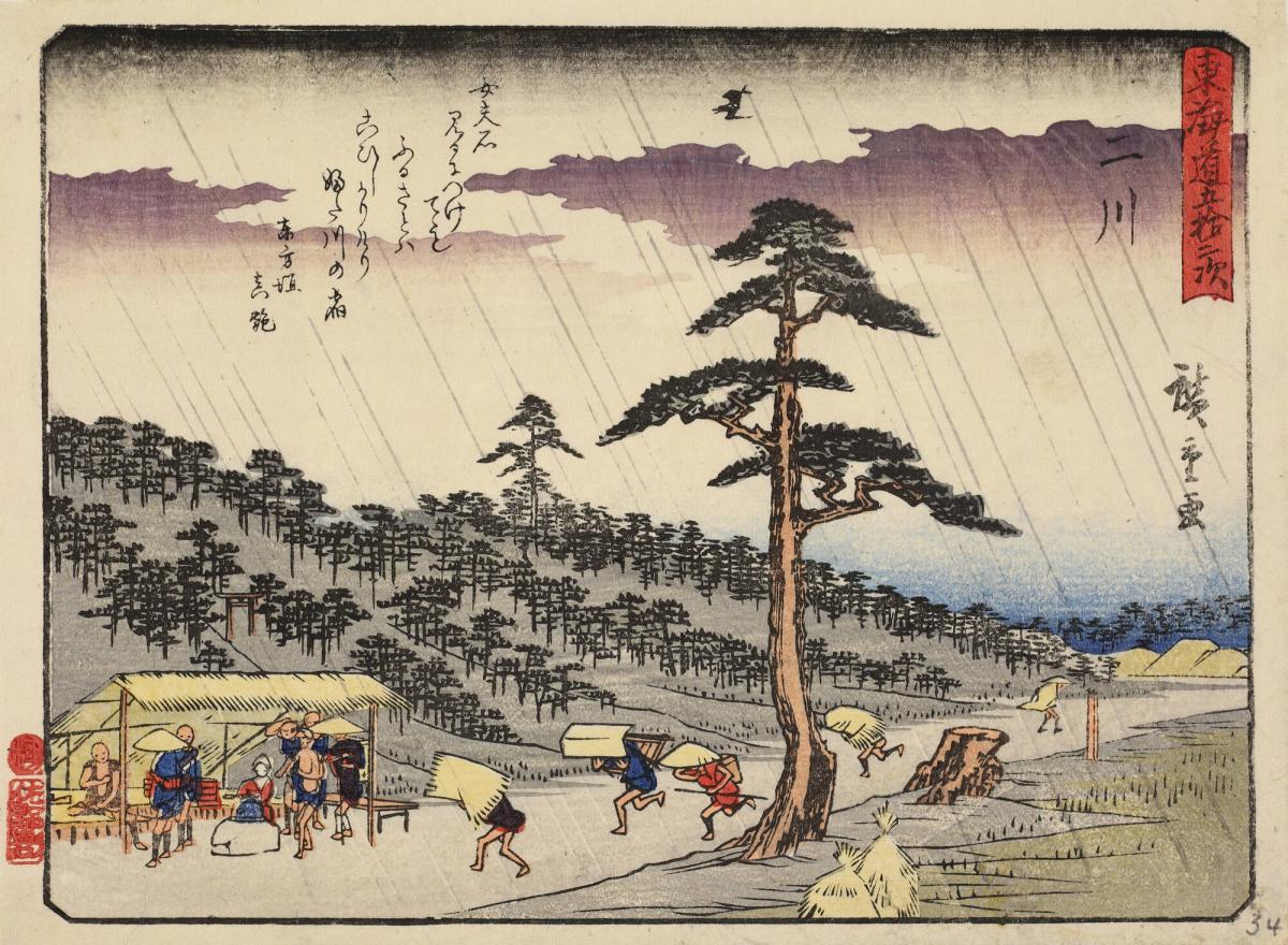 Rain at Futagawa, with a Poem by Tohogaki Matsuya, no. 34 from the series The Fifty-three Stations of the Tōkaidō