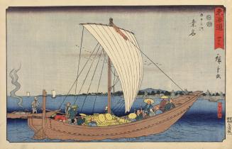 The Seven-ri Ferry Boat Approaching Kuwana, no. 43 from the series The Fifty-three Stations of the Tōkaidō, also called the Reisho Tōkaidō