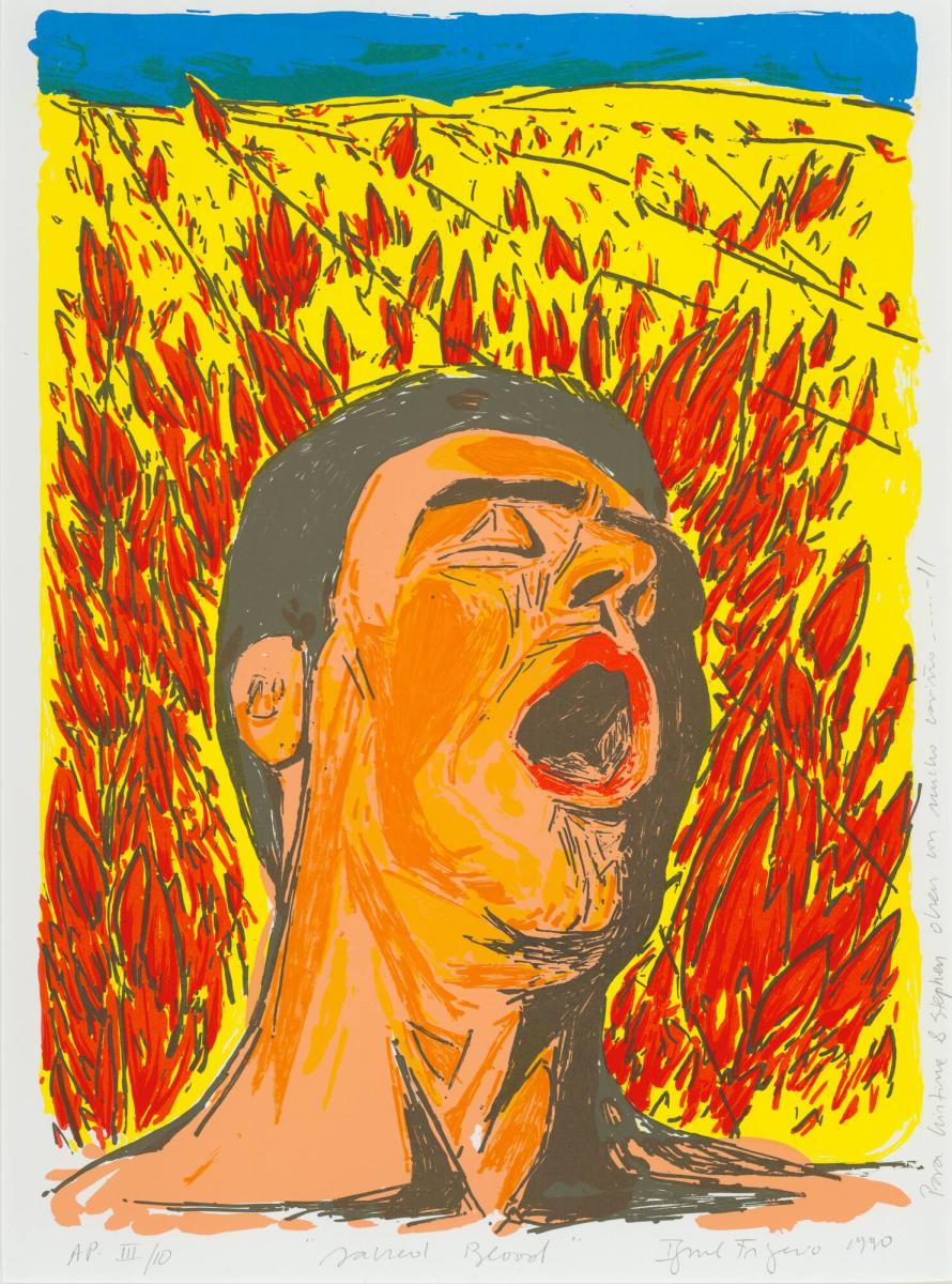 Not on viewSacred Blood suggests the transformative power of immolation. Head raised and open-mouthed as if in ecstasy, a self-portrait of the artist appears engulfed by a field of blood-red flames. The reference to the blood of Christ here also grants the print a religious undertone.