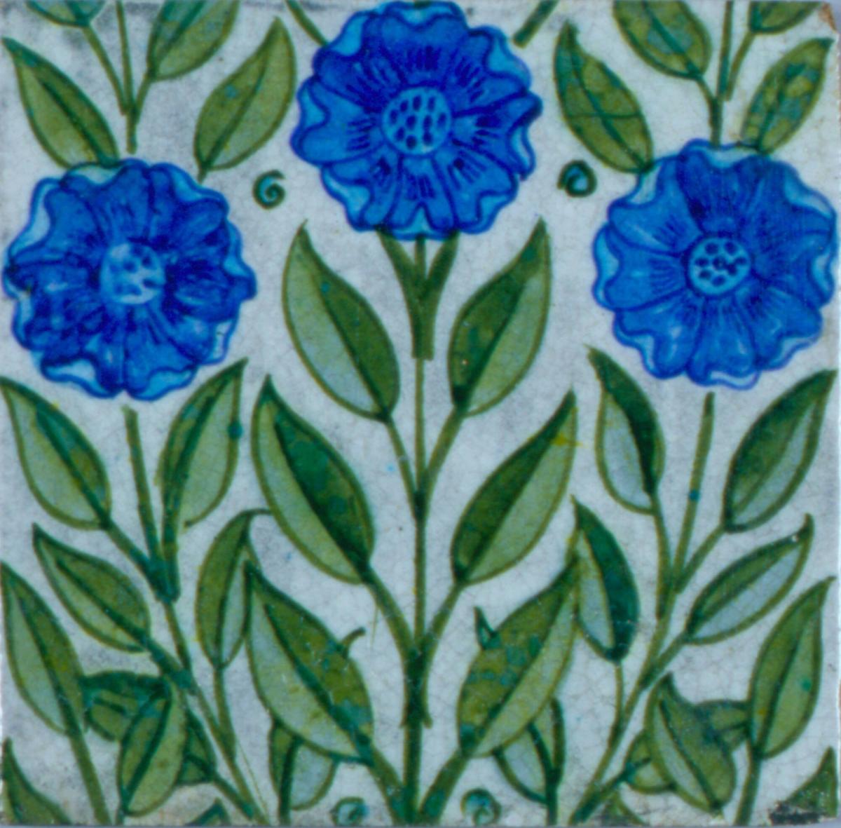 Hand-painted Pottery Tile with Three Blue Rose Flowers and Foliage