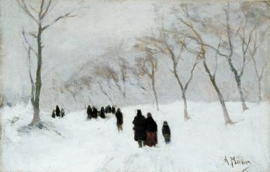 Not on viewAnton Mauve was one of the leading painters of the Hague School, a group known for its interest in recording the natural effects of light and atmosphere. Mauve particularly excelled in rendering the profound silence and desolation of winter and often painted directly from nature – en plein air or outdoors – to capture the nuances of his favorite season. It seems likely that the Oberlin picture was painted on the spot, considering its modest size, swift brushwork, and the fact that the painted design extends beyond the edges of the original canvas stretcher. The modest winter scene set with an almost monochromatic palette is suffused with a silvery light, adding a delicate, lyrical quality to the picture.