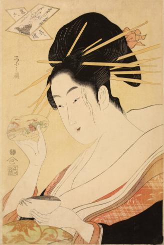 Not on viewThis series presented six images of contemporary courtesans paired with allusions to the Six Immortal Poets (Rokkasen 六歌仙), a group of widely admired 9th-century Japanese poets. In the Edo period many people knew these poets was through a card game, uta-garuta 歌ガルタ, which was played by matching the first part of a famous poem with its conclusion. Here the poet is Kisen Hōshi 喜撰法師, who is represented in the upper left corner in his card-game form.