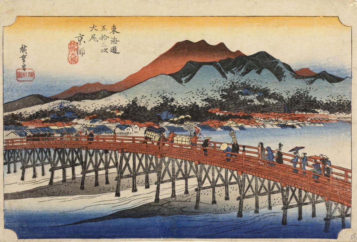The Great Bridge over the Kamo River at Sanjo in Kyoto, no. 55 from the series Fifty-three Stations of the Tōkaidō
