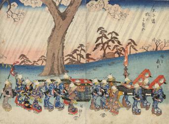 Not on viewFoxes, dressed up in kimono, are processing to the Oji Shinto Shrine in Edo. In Japanese folklore, the fox wedding is a strange event correlated with what is commonly referred to as a sunshower: the presence of rain without many clouds in the sky, as depicted in the image. This weather phenomenon is always closely related to foxes, who in Japanese folktales often play tricks on humans. A variety of Shinto (a Japanese religion and spirituality connected to nature) rituals and festivals have been developed in various parts of Japan relating to the fox wedding. The fox wedding procession seen here is reenacted on New Year’s Eve at the Oji Shinto Shrine. Human and animal identities are often merged through such performances and events.