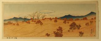 The Road at Arayu near Shiobara was designed by Hasui in 1918 and printed by Watanabe in 1919. It depicts the landscape around Shiobara, a town north of Tokyo, which had long been famous for its relaxing natural hot springs. The elongated horizontal format and warm color scheme of this print are unusual for Hasui and reveal it to be an early, experimental work. Because the original blocks for this image were destroyed in the great 1923 Kanto earthquake, it was never reprinted and is relatively rare, especially in the excellent condition of this impression from the Ainsworth collection.