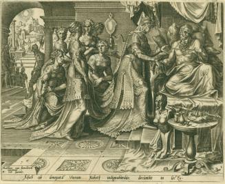 Not on viewThe story of Ahab, Naboth, Jezebel, and Elijah from the Book of Kings serves as the textual basis for this action-packed print, engraved after designs by Maerten van Heemskerck. It traces the story of the crime and punishment of Queen Jezebel, who conspired to murder a man named Naboth after he refused to sell a plot of land to her husband, King Ahab. In response, Jezebel had Naboth falsely accused with the sin of cursing God and the King. Ahab then claimed Naboth's land, until the prophet Elijah warned him of God's anger at this. More than many artists of his time, excepting those who made illustrations for bibles, Maerten van Heemskerck turned time and again to the stories of the Old Testament as the subject matter for his drawings.