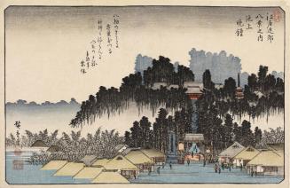 Not on viewIn the Eight Views, the Evening Bell theme always implies that the bell is ringing at a Buddhist temple. In this print, we see Ikegami Honmonji temple, perched atop a forested hill in southern Edo. It is the head temple of the Nichiren sect of Buddhism. Still a major site in Tokyo, it has maintained its harmonious relationship with nature since its founding in 1282.