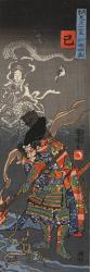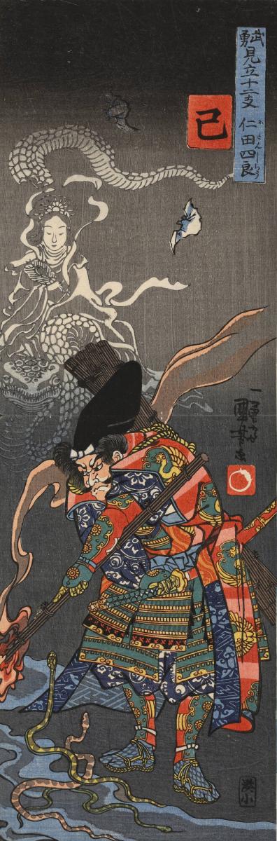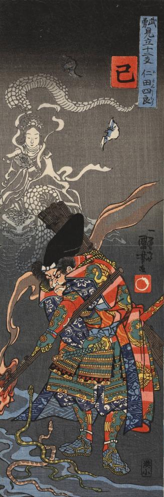 Nitta Shirō Tadatsune and the Apparition of the Goddess Benten Riding a Serpent in the Cave on Mt. Fuji, no. 6 from the series Bravery Matched with the Twelve Animals of the Zodiac