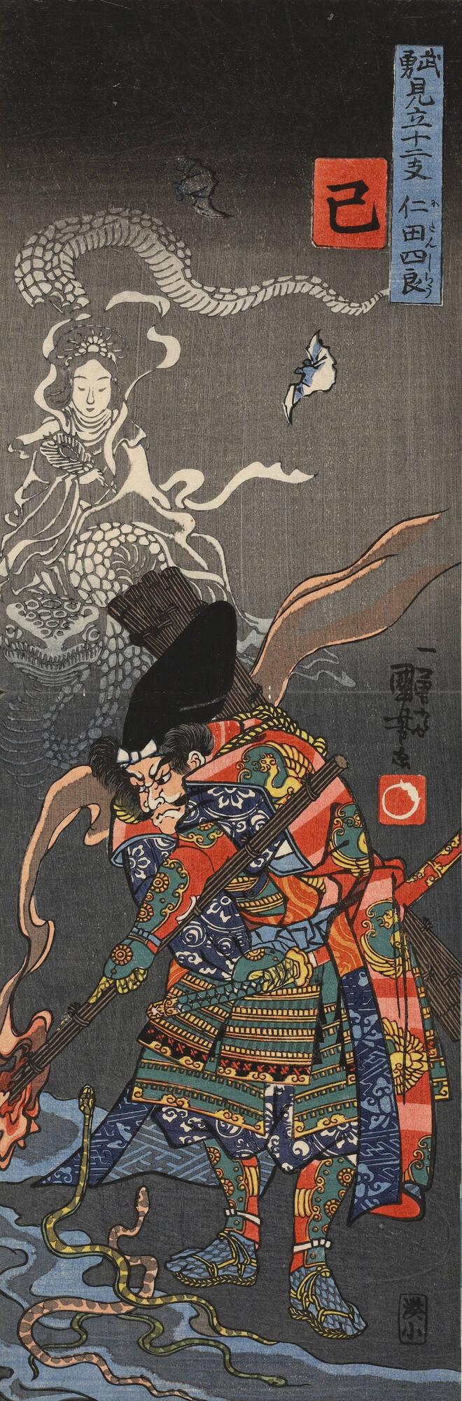 Nitta Shirō Tadatsune and the Apparition of the Goddess Benten Riding a Serpent in the Cave on Mt. Fuji, no. 6 from the series Bravery Matched with the Twelve Animals of the Zodiac