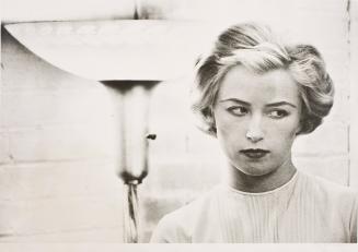 From her early work as an undergraduate and after her move to New York City in 1977, Sherman continued to assume various roles as inventor, actress, director, costumer, and producer of scenarios that she photographed. Her "film stills" comment on a range of gender issues and were inspired by the small black-and-white glossies of actors that used to hang in movie theater lobbies. The AMAM's photograph belongs to a series of sixty-five grainy, black-and-white images that have the look and feel of the 1950s, presenting women as victims or predators- stereotypes reinforced by society and the movies. Dressed in a jewel-neck white blouse, carefully made up and coiffed, and posed next to a lamp, Sherman faces the viewer but averts her eyes, all within a tightly constrained space. "When I'm really working there is this curiosity to see myself," Sherman says. "It's one of the most pleasurable parts, to look in the mirror and sort of not recognize myself. It gets even better after you develop the film. In the photograph you see things you didn't even know you were doing."