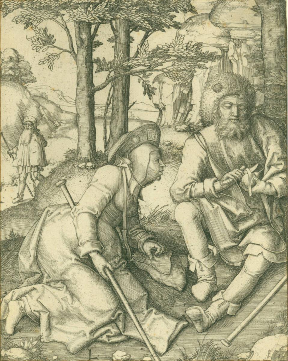 Not on viewThe two figures at rest in this calm, subtle work by Lucas van Leyden are religious pilgrims, identifiable by their staffs, sacks, and the scallop shells that adorn their hats. In the Middle Ages, Christians often made pilgrimages to religious epicenters such as Santiago de Compostela. For those who were unable, prints such as this one provided a way of experiencing devotion similar to that felt by pilgrims, within the context of their own homes.