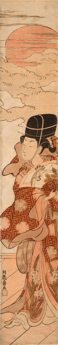 Not on viewOn a stage featuring a huge rising sun painted in the background, a young female dancer wears an eboshi court cap. This type of dancing may have been the precursor to a later New Year’s type of door-to-door performance or street entertainment known as manzai, but it is difficult to tell. The depiction of the female dancer here reflects the very popular style of Harunobu, which other print designers copied and continued after his sudden death in 1770.