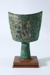 On viewThe náo was a bell used in religious rituals during China’s Shang Dynasty (ca. 1600 BC–ca. 1046 BC). It was held upright with the handle, and played with a mallet. A zoomorphic motif known as the “animal mask” design appears on the bell’s face. This was one of the most frequent decorations on Shang dynasty vessels, usually including horns, wide-set eyes, a snout, and open jaws. No surviving records from the period reference this motif, so its specific meaning remains a mystery.