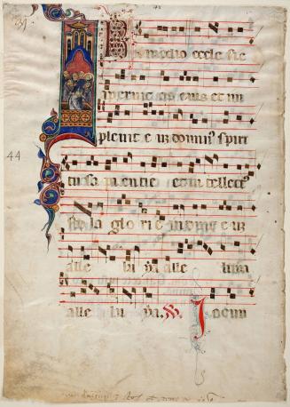 Not on viewLarge, often multi-volume choir books recorded the musical component of communal worship in the Middle Ages. Known today as graduals and antiphonaries, these choir books were used in conjunction with service books during the public services of Mass and the Divine Office, respectively. Standing before a lectern, choir members read from these books in unison or responsorially, reciting or singing lyrics that corresponded with each day’s worship.