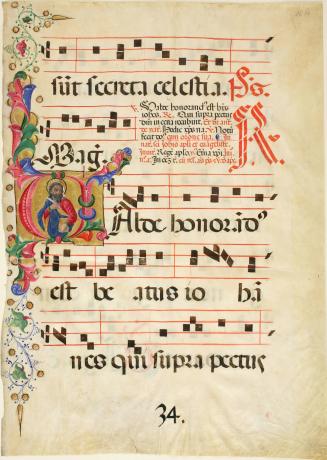 Not on viewThis leaf comes from an antiphonary commissioned for the cathedral of Lucca by its bishop, Stefano Trenta. The leaf places John the Evangelist, holding a pen and a book, in a letter “V” opening a text that means “Very highly we must venerate blessed John.” This text was sung at the office of Lauds on the saint’s feast day, December 27.
