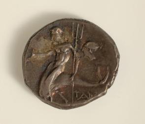 Didrachm: Obverse, Galloping Horseman Holding Spear; Reverse, Phalanthos or Taras on a Dolphin Holding Trident in Left Hand and Amphora (?) on Right (Female Head Behind Him)