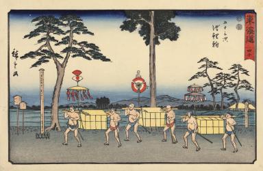 Porters at Chiryu, no. 40 from the series The Fifty-three Stations of the Tōkaidō, also called the Reisho Tōkaidō