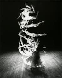 Not on viewTo produce this image of the Martels and Mignon dance team, Edgerton made use of a device of his own invention called the multiflash. The multiflash fires bright light in rapid succession while the camera lens remains open, therefore recording movement at regular intervals for a precise length of time. One of Edgerton’s challenges with the multiflash was to ensure that areas of the image that were subject to many flashes did not get overexposed. Although the movement of the male dancer is difficult to discern in this image, the complete somersault of the female is rendered with surprising clarity.
