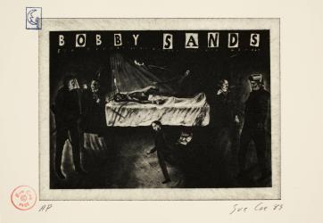 Not on viewSocial and political activist Sue Coe here depicts the death of Bobby Sands, a member of the Provisional Irish Republican Army (IRA). While incarcerated, Sands died leading a 1981 hunger strike in which he and other IRA detainees sought to regain status as political prisoners. His death incited a new surge of IRA activity and increased tensions between Irish nationalists and the British government. Coe's predilection for associating evil with power and innocence with the oppressed is evident in the stark contrast of Sand's white corpse against the ominous black background.