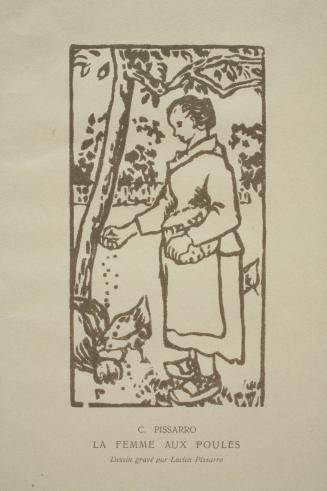 Not on viewWorking in the second half of the 19th century, Camille Pissarro sought through his art to capture the timeless beauty of the French countryside. As advances in industry and technology proliferated across Europe, Pissarro’s rural scenes were seen as nostalgic, if not sentimental, odes to the working class. His depictions of agrarian farm life idealized labor, while still posing an alternative to the rapid urbanization of the day. In this scene, a peasant woman feeds a small group of chickens pecking around her feet. Narrowly framed and simplistically drawn, the act of feeding reads as a caring and intimate gesture. Labor is represented as being in harmony with and inherent to nature; the chickens are dependent upon the woman, as she is dependent upon them.