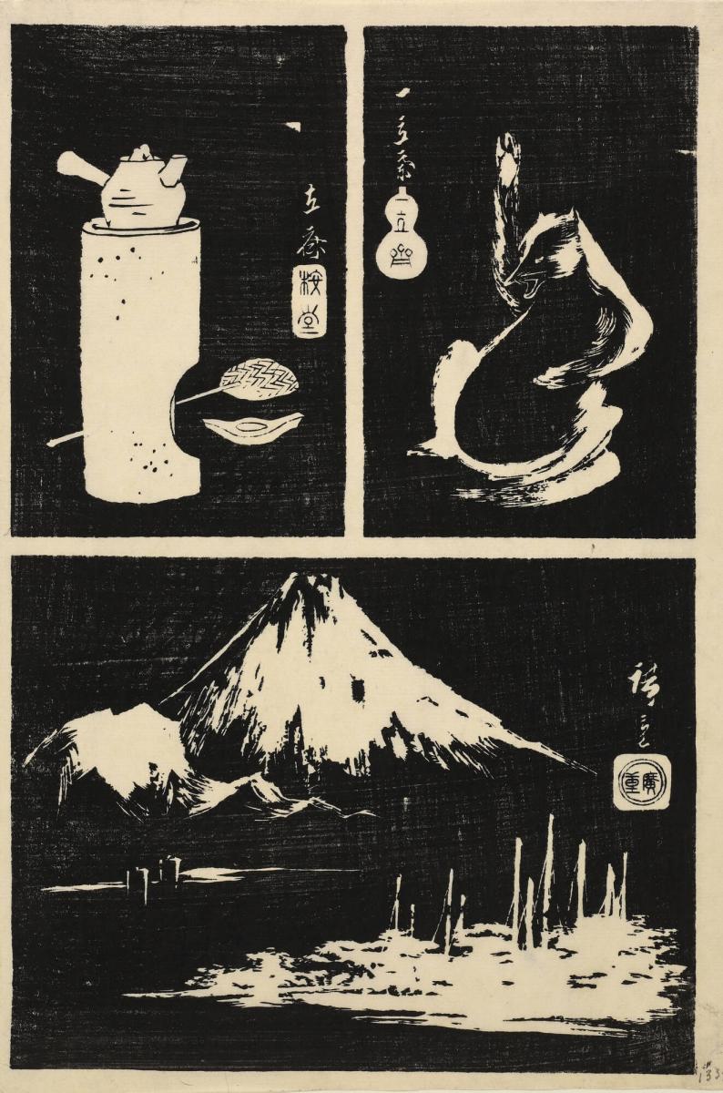 Badger, Tea Kettle, and Mt. Fuji, from an untitled series of harimaze, or assemblage prints