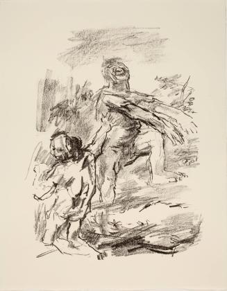 Not on viewIn 1963, Austrian painter Oskar Kokoschka created a series of 16 lithographs to illustrate William Shakespeare’s King Lear. One of the Bard’s most highly-regarded tragedies, the play follows the elderly King Lear’s descent into madness after foolishly dividing his estate among two of his three daughters based on their false flattery, resulting in a tragic outcome for all. Kokoschka’s series depicts critical points in the narrative which often correspond to dialogue by Lear and his daughters Goneril, Regan, and Cordelia, in addition to that of the other characters vying for the throne. Providing minimal information about the setting of each scene, Kokoschka’s sketchy compositions instead focus on the characters, each depicted with the artist’s characteristic energetic expressionism.