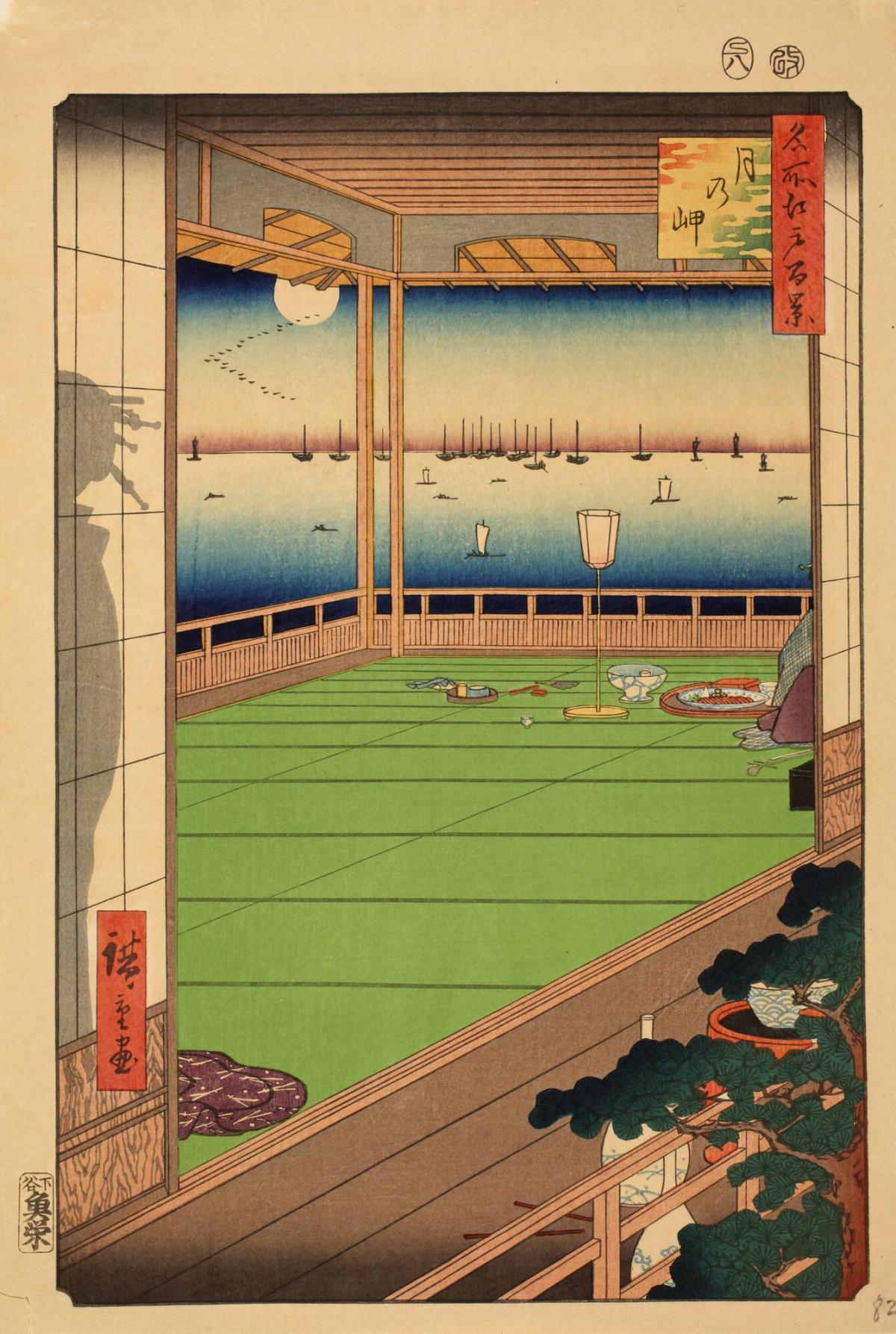 Not on viewNo. 82 (fall section) on the title page for the series. Second-floor views were popular in the Shinagawa pleasure district. Here we look from the hallway through an entertainment parlor to a view of the harbor beyond. Outside the window, the sea shines white in the moon’s light, changing color gradually with the sky. The shadow of a courtesan is cast on the papered shoji, or sliding door, to the left. Telltale signs of a seated geisha appear behind the shoji to the right; her shamisen handle and black lacquered shamisen case peek out as well. Miscellaneous objects scattered about the parlor floor, like the fan, hand cloth, and tobacco smoking objects, or left in the hallway, like the sake pouring vessels and bowl, capture a sense of the silence after the party is over.