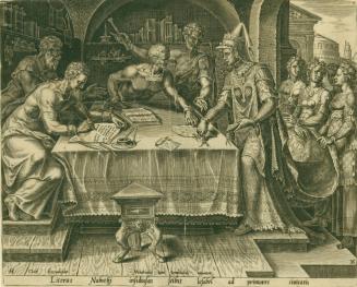 Not on viewThe story of Ahab, Naboth, Jezebel, and Elijah from the Book of Kings serves as the textual basis for this action-packed print, engraved after designs by Maerten van Heemskerck. It traces the story of the crime and punishment of Queen Jezebel, who conspired to murder a man named Naboth after he refused to sell a plot of land to her husband, King Ahab. In response, Jezebel had Naboth falsely accused with the sin of cursing God and the King. Ahab then claimed Naboth's land, until the prophet Elijah warned him of God's anger at this. More than many artists of his time, excepting those who made illustrations for bibles, Maerten van Heemskerck turned time and again to the stories of the Old Testament as the subject matter for his drawings.