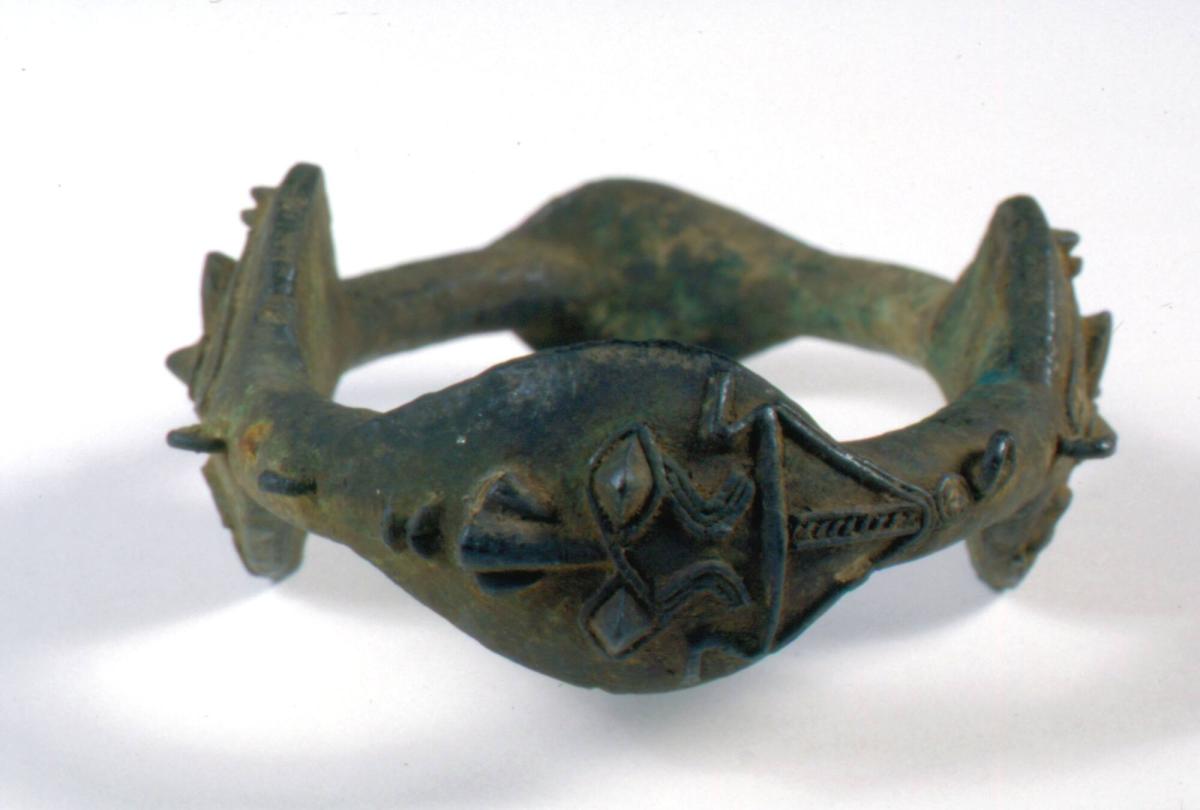On viewThis intricate bracelet was likely worn by a member of the Oshugbo society, a fraternal organization that commands political and social influence in Yorùbá society. Membership into this society is selective; recruitment occurs either through family inheritance or when one is chosen by ancestors. Oshugbo members were said to identify each other by means of “little brass figures worn on the arm,” which may refer to the carved faces on this bracelet. However, recent archeological work indicates that brass regalia like this example were not worn only within the Oshugbo society. Royalty, priests, and others who could afford the high price of brass also wore such bracelets. This well-executed design reveals the high level of metal casting developed by the people of Ijebu.