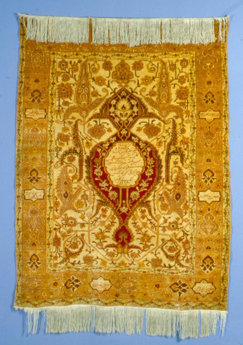 The composition of intertwined, symmetrical floral patterns—a combination of stylized peony and palmette motifs—delivers a visual effect of infinity. The patterns also highlight a large cartouche in the central medallion and eight border cartouches that frame Persian inscriptions, lines from selected odes of Persia’s beloved poet, Sa’di Shirazi (1210–ca. 1291–2).