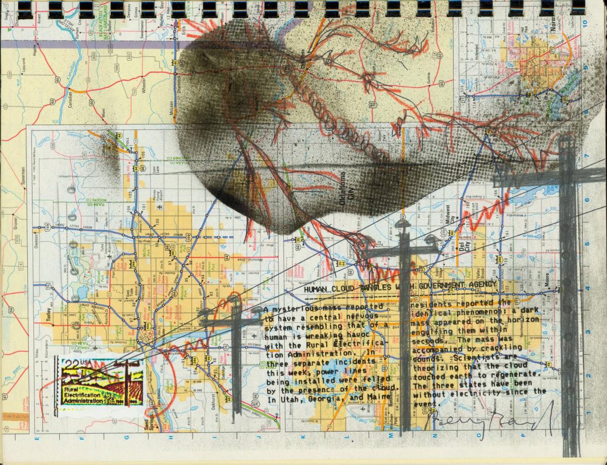 MediumTopographical map with applied photocopy, crayon, ink and pencil on paper