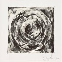 The AMAM drawing is, in part, a replica of a larger black-and-white painting of 1959, which was subsequently destroyed by fire in 1961. It dates from the same year Johns began making prints, and in it, he manipulates the graphite wash almost as if it were the liquid used in lithography, gaining a large variety of textures and tones. The artist stated that he preferred to paint flat symbols, such as flags and targets, because he did not need to design them-they were "things the mind already knows. That gave me room to work on other levels."