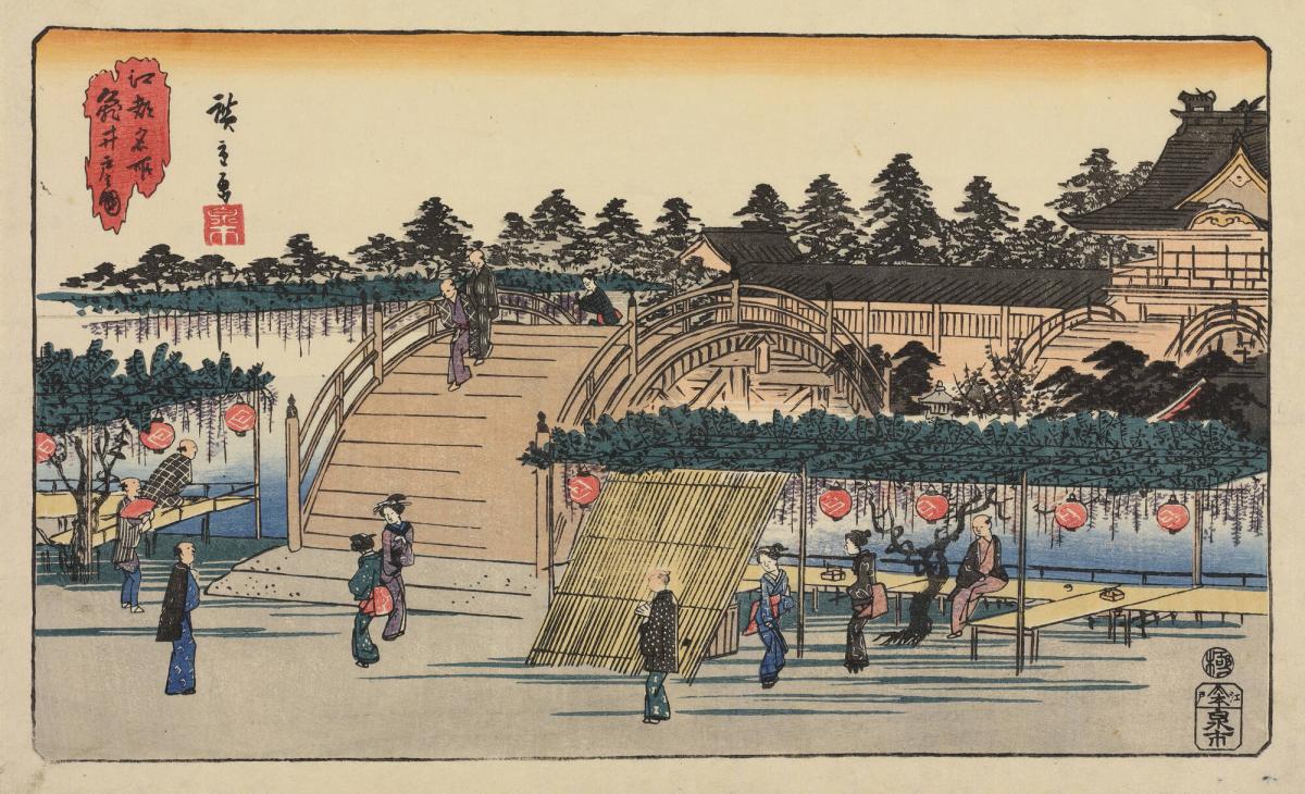 Wisteria Arbor and Drum Bridge at the Temman Shrine at Kameido, from the series Famous Places in Edo