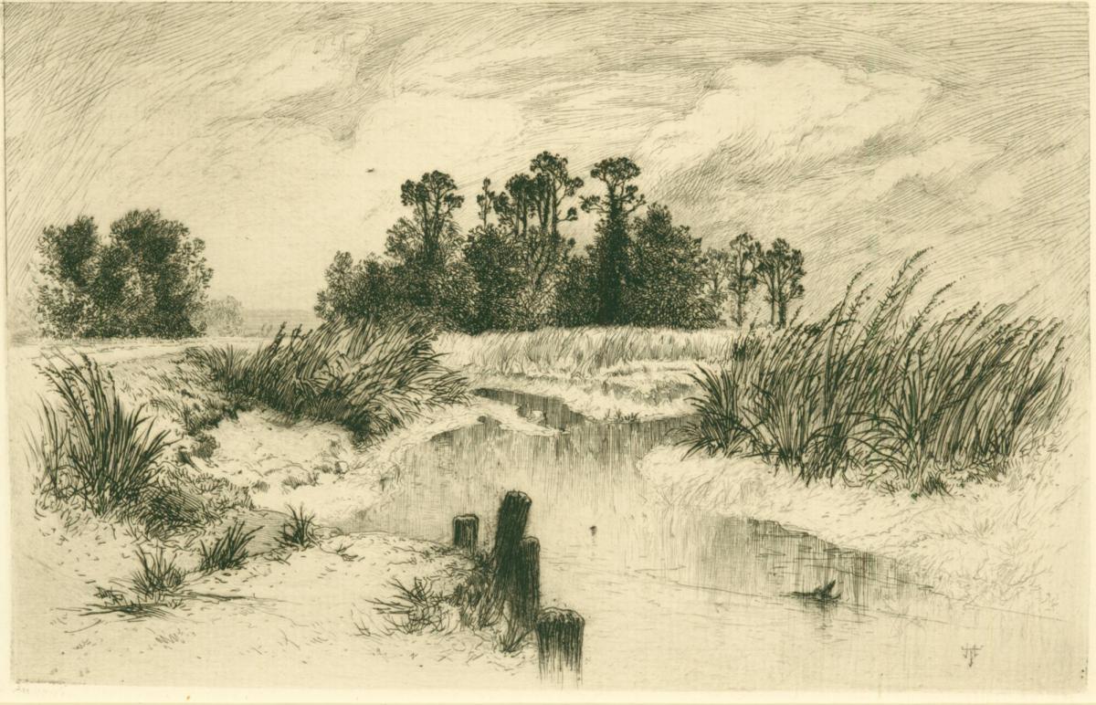 Not on viewMore famous for his majestic views of the Grand Canyon, Yosemite, and other western sites, Moran also composed studies of the eastern landscape from the perspective of an inveterate walker. The feathery etching technique enhances his dynamic depiction of a windblown reed marsh. Moran was an admirer of the work of J.M.W. Turner, whose sublime conception of landscape remained a significant influence throughout his career.