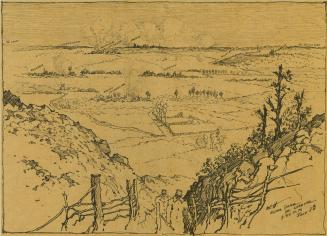 Not on viewThis drawing was made by an American correspondent of Century Magazine sent to France to record the First World War. Hale was positioned in Arras, Soissons, and Verdun when these towns were bombed and witnessed the ensuing destruction. His drawings are records of specific moments and places; on each he wrote the date and time, emphasizing the documentary aspect of his work. Although death is always present, Hale focuses here on the bleak, war-torn landscape of Northern France rather than the loss of human life; he meticulously labeled each battlefield on the horizon.