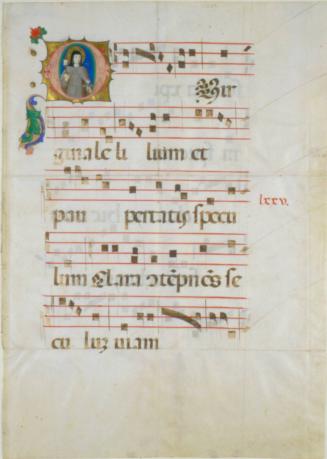 Not on viewThe association of Saint Clare of Assisi with the monstrance derives from a legend in her hagiography. When Assisi was attacked in 1243 under the orders of Emperor Frederick II, a sick Saint Clare went to the monastery in order to pray, bringing with her a monstrance bearing the Eucharistic host. While Clare prayed, a child’s voice came from the monstrance and promised to protect her. This gradual leaf references this legend, portraying Saint Clare holding the Eucharistic host in a monstrance, along with a white lily, an attribute representing her purity. Placing strong emphasis on the importance of the Eucharist, the image would have been an appropriate decoration for the introit sung at Mass on Saint Clare’s feast day, August 12. This leaf comes from a gradual that was part of a large set of choir books commissioned by Cardinal Johannes Bessarion, a leading humanist scholar who also worked to reconcile the Catholic and Orthodox Churches.