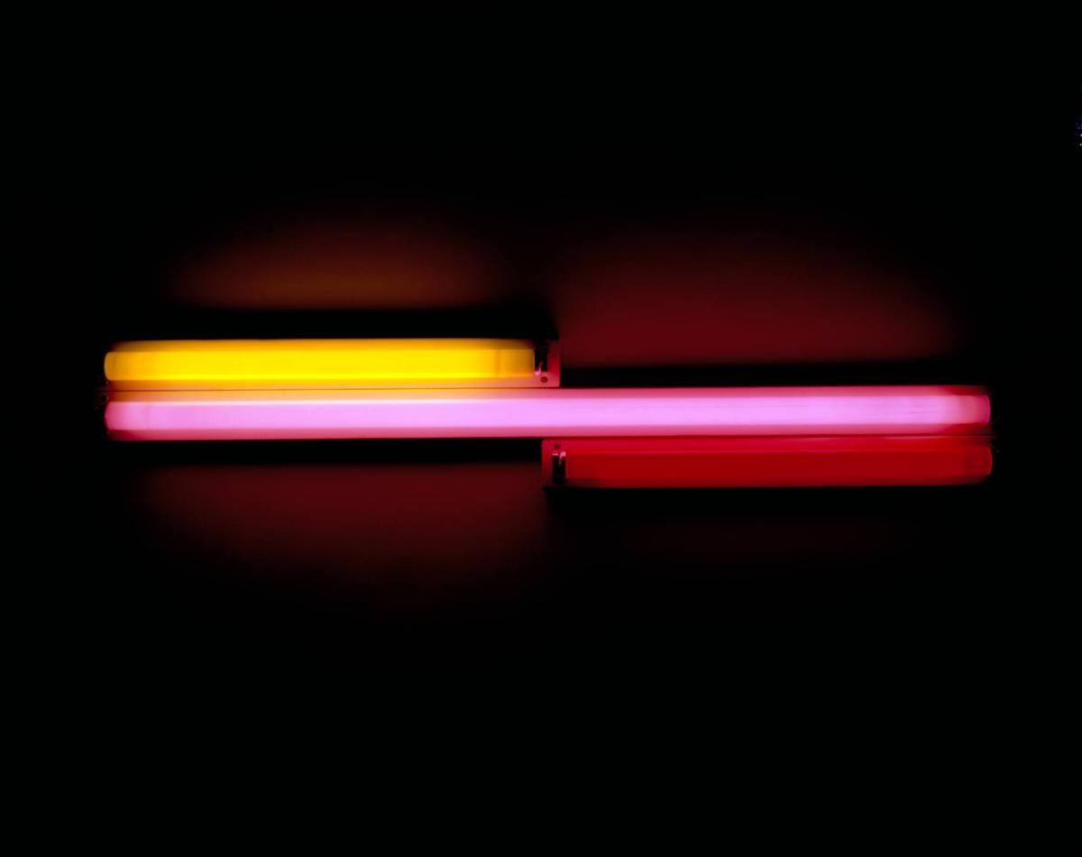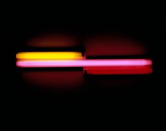 The AMAM collection includes two fluorescent sculptures by Flavin: Untitled (to Ellen Johnson, fondly), a four-foot-wide piece with red, pink, and yellow fluorescent lights; and Untitled (to Charles Cowles), a work from 1963 composed of two eightfoot- long tubes of daylight and blue fluorescent lights. Flavin's Untitled works are characteristically dedicated to friends, colleagues, and fellow artists. The AMAM's examples honor Oberlin College professor Ellen Johnson and art dealer and collector Charles Cowles, who, at the time of the dedication, was publisher of Art Forum. In the absence of explicit subject matter, these tributes make personal connections with the piece.