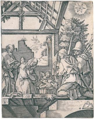 Not on viewThis delicate representation of the Adoration of the Shepherds depicts an episode from Luke 2:15-20, in which a group of shepherds journeys to Bethlehem to see the Christ child, after being told of his birth by an angel. One of many copies that Marcantonio Raimondi made after prints by Albrecht Dürer, this was executed while Marcantonio was living in Venice (ca. 1506-ca. 1508). Around the time that this print was made, Dürer famously took legal action against Marcantonio for including Dürer's monogram, "AD," in the engraved copies he made of the artist's prints.