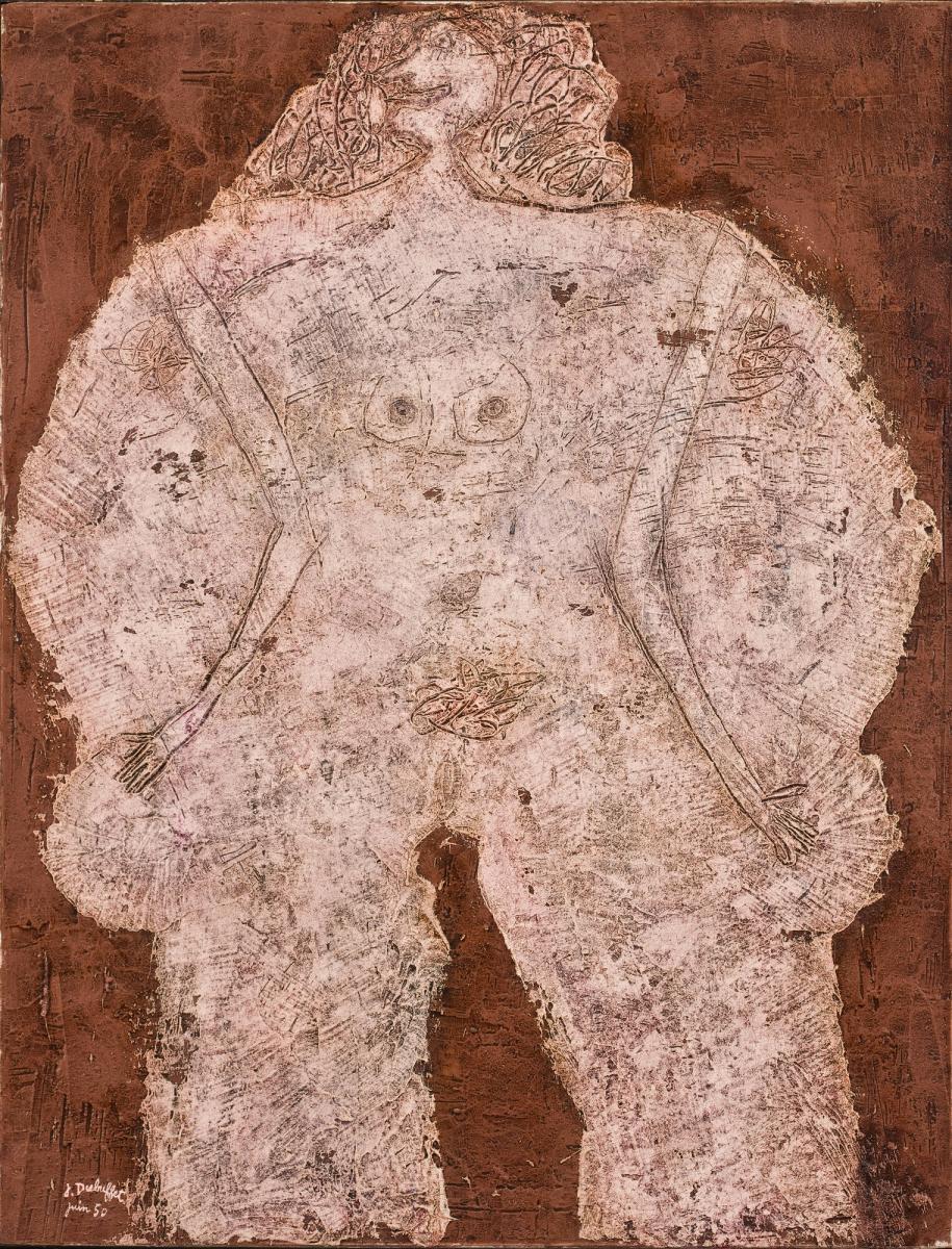Not on viewDubuffet was a significant force in postwar art, and perhaps one of the most anti-artistic in his disregard for conventional medium and imagery, especially the human body. Crucial to his art making was the separation of man and nature, and his opposition to classic, humanist culture. Many of his primitivist reference points overlap with the goals of the Abstract Expressionist painters. Dubuffet's cycle of paintings entitled Corps de Dame, produced in 1950-51, focused on the female nude – not necessarily as a thing of traditional beauty but as a dense matter, spread out across the canvas. In this work, the head, torso and limbs are flattened into the composition and set off from the background and canvas edge by a thick, dark brown ground. A variety of paint textures, brushwork, scraping and scoring, offer the only substance or presence to the altered form.