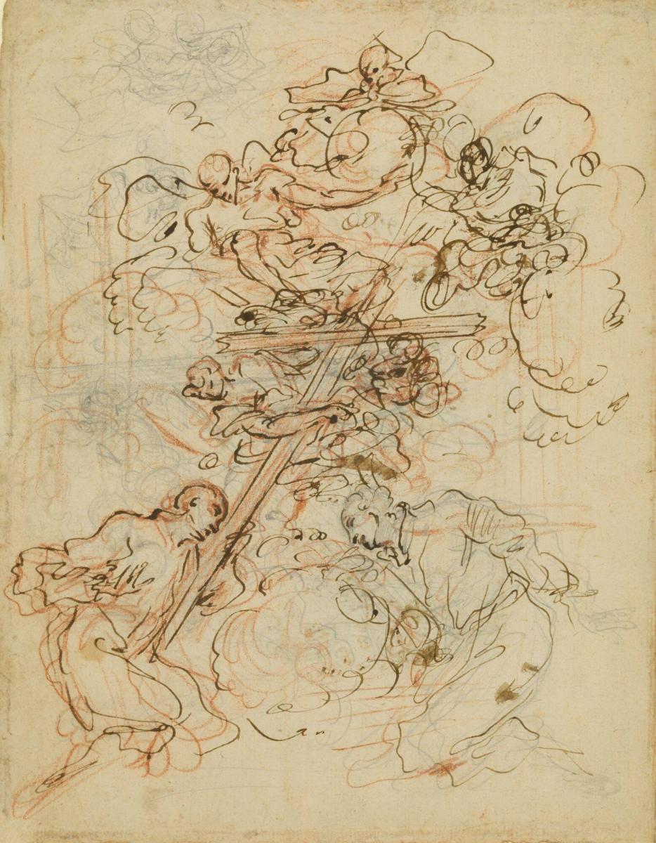 Adoration of the Cross by Two Deacons with Angels; Studies for Altarpiece with Immaculate Conception or Virgin in Glory (verso)