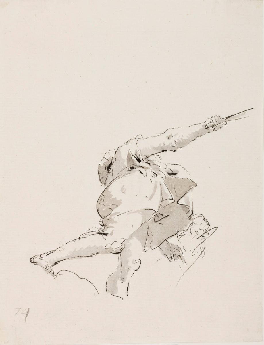 Not on viewThis drawing is one of many from a sketchbook Tiepolo made as a repertory of poses of figures, often on clouds, seen in steep perspective from below. Tiepolo was clearly fascinated by the challenge of depicting foreshortened figures, many of which populate the dramatic ceiling frescos for which he is best known.