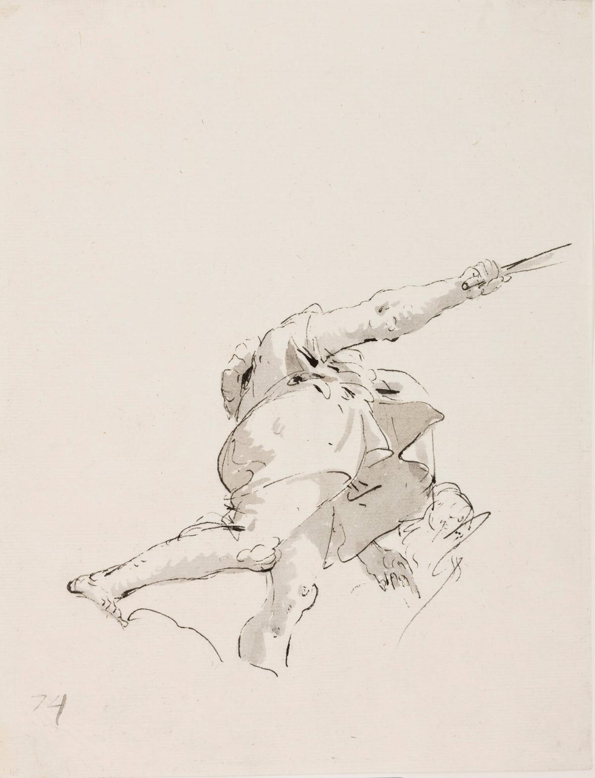 This drawing is one of many from a sketchbook Tiepolo made as a repertory of poses of figures, often on clouds, seen in steep perspective from below. Tiepolo was clearly fascinated by the challenge of depicting foreshortened figures, many of which populate the dramatic ceiling frescos for which he is best known.