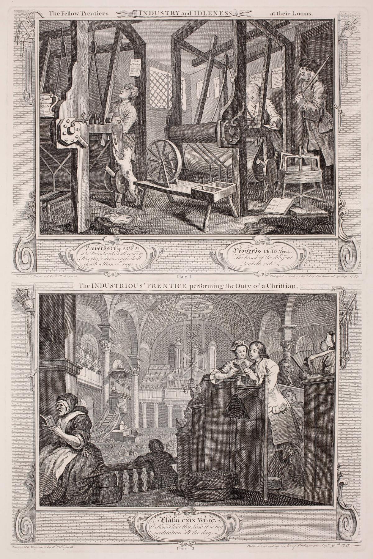The Fellow `Prentices at Their Looms, plate 1 from the series Industry and Ildleness; The Industrious `Prentice Performing the Duty of a Christian, plate 2 from the series Industry and Ildleness